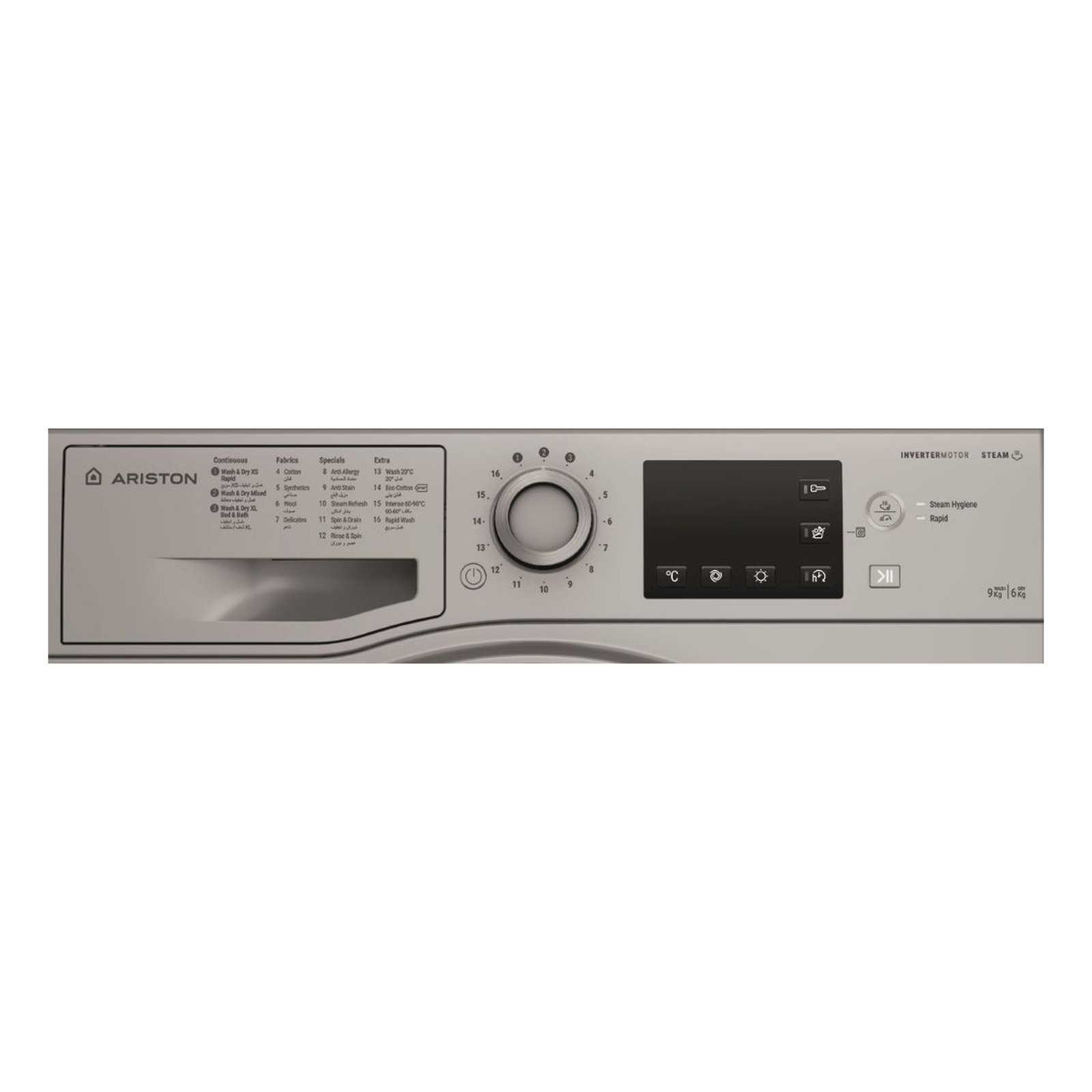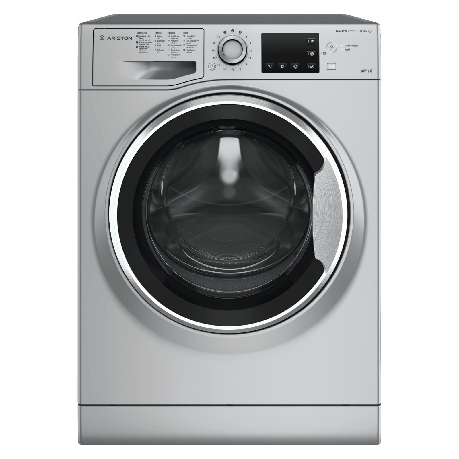 Simplify your laundry routine with the Ariston Front Load Washer and Dryer NDB9648 9/6 kg Silver – a powerful, space-saving combo washer-dryer designed for busy UAE households from Al Wardah Elect. & Watch Co. This free-standing front-load machine handles large loads with efficient washing and effective drying, delivering clean, ready-to-wear clothes while saving time and energy.